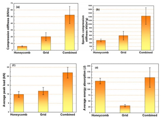 Average properties of sandwich specimens: (a) compression stiffness, (b) specific compression stiffness, (c) peak load, and (d) energy absorption [82].