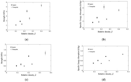 Subhash et al. [61] examined the function of polymeric structural foams with varying porosity levels, and low density (<1 g/cm3) and high density (>1 g/cm3), under low and high strain rate loadings. It was found that an increase in foam density also led to an increase in Young’s modulus, yield strength, maximal stress, and strain to failure, while the high-density foams showed an increasing consistency in deformity, and resulted in a ductile-like fracture form, the low-density foams failed as a result of the prior disintegration of large porous cells. In addition, Saha et al. [62] carried out a test on two polymeric foams; cross-linked poly-vinyl chloride (PVC) and polyurethane (PUR). This was done under compression loading at varying strain rates. The analysis showed that peak stress and energy absorption were largely dependent on the microstructure, density, foam materials, and strain rate.