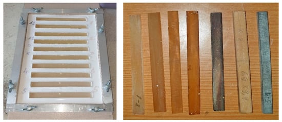 The experimental values of the elasticity modulus for each type of studied binders were obtained from the results of testing three samples. A general view of a silicone mould for making samples and cured samples of binders is shown in Figure 1.