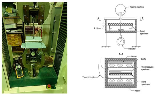 The temperature during the tests was maintained by a thermostat and controlled by two thermocouples. One thermocouple measured the temperature on the surface of the bent specimen. The second thermocouple measured the temperature inside the control specimen, located next to the test specimen. The installation diagram is shown in Figure 2.
