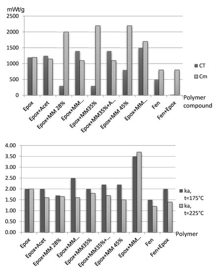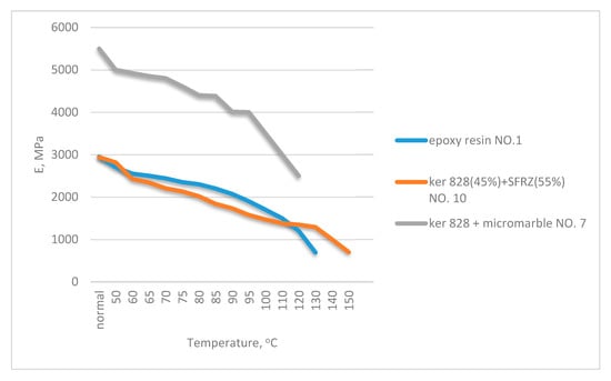 Experimentally defined dependences of epoxy, epoxy-phenolic, and phenolic polymers deformation moduli on temperature are shown in Figure 3 and Figure 4; they demonstrate the intense monotonically decreasing modulus with increasing temperature. The modulus temperature breaking point was minimal for epoxy resin (95–100 °C), and it increased with phenolic content.