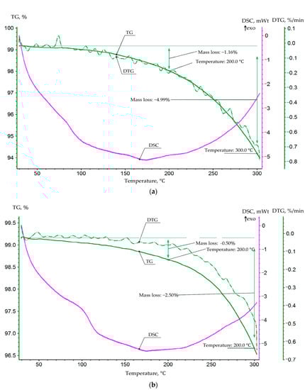 The mass–emission and heat–emission of the glassed polymers with temperature increase (Figure 5) were studied to evaluate structural changes in polymers.