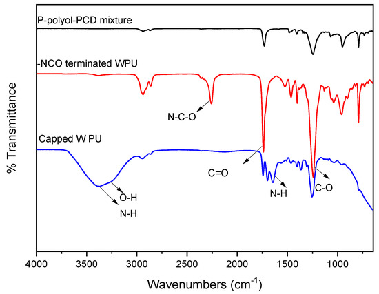 The measured hydroxyl value of P-polyol was determined to be 62.3 mg KOH (the amount of KOH (in mg) to neutralize any acid) using the titration method. The molecular weight of P-polyol was calculated to be 450 g/mol by dividing 56.11 g/mol by the hydroxyl value (62.3 mg KOH/g) and the number of –OH groups (2) of P-polyol. The structure of the synthesized WPU samples was confirmed using FT-IR spectrometry (Figure 2). After IPDI was added to the P-polyol–PCD mixture, a typical –NCO peak at 2275 cm−1 emerged in the FT-IR spectrum. The terminal –NCO peak disappeared when ED, which served as the chain extender, was added to the reaction mixture (Figure 2). The characteristic N–H peaks of ED appeared at 3200 and 1660 cm−1, and the –OH peak of water was detected at 3400 cm−1 and was ascribed to the addition of water to prepare WPUs.