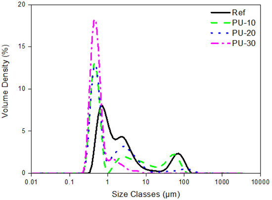 The average size (Sauter mean diameter) of WPU particles in water was determined using the aforementioned PSA, and the results showing the trimodal distribution pattern are presented in Figure 3. The particle size of Ref was 1.21 μm, and it decreased to 0.70, 0.68, and 0.49 μm for the PU-10, PU-20 and PU-30 samples, respectively, with increasing P-polyol amount. It has been reported that smaller WPU particles are correlated with higher hydrophilicity [23,24]. The decrease in particle size with increasing P-polyol amount suggested that P-polyol presented hydrophilic properties. The hydrophilic properties of phosphate monomers were reported by Puri et al. [25], who indicated that the addition of ethylene glycol methacrylate phosphate to polymethyl methacrylate resin leads to hydrophilicity, increasing proportionally to the amount of phosphate monomer.