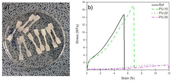 Tensile strength measurements were performed to analyze the mechanical properties of the WPU film, and the results are illustrated in Figure 4. The addition of P-polyol increased the tensile strength by 16% (from 14.7 (±0.6) MPa for Ref to 17.1 (±0.2) MPa for PU-10). However, the tensile strength of the WPU films with higher P-polyol contents decreased abruptly.
