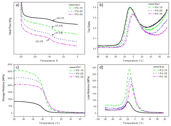 Polyurethanes present two glass transition temperatures (Tg), one for the soft segment and another for the hard segment. The Tg of the soft segment of Ref was determined to be −36.31 °C by averaging the results of two DSC runs (Figure 5a). The Tg values of the other analyzed WPUs were similar. However, the Tg values obtained using DMA (tan δ) were different depending on the amount of P-polyol (Figure 5b and Table 3). The Tg of PU-10 (−5.4 °C) was 2.6 °C higher than that of Ref (−8.0 °C). The difference in the Tg values of PU-20 (−3.0 °C) and PU-30 (−0.8 °C) was similar (2.2 °C). The addition of P-polyol to PCD caused the storage modulus of the WPU samples to change from 700 MPa for Ref to 3042 MPa for PU-10 (Figure 5c), owing to the rigid structure of P-polyol. However, when the amount of P-polyol was further increased, the storage modulus of the WPU samples decreased. The increase in loss modulus with increasing P-polyol amount followed a similar trend to Tg (Figure 5d).
