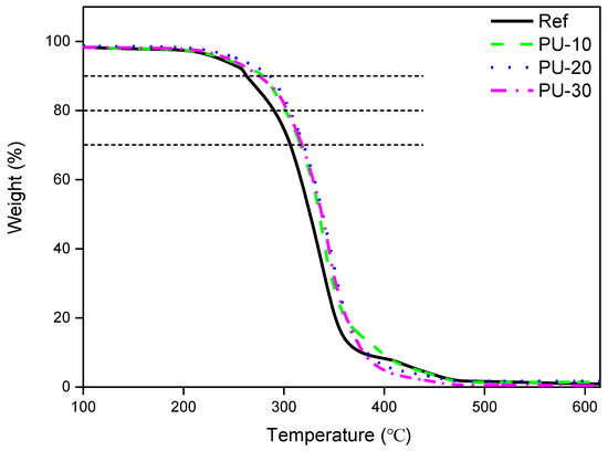 The thermal stability of WPUs was tested using TGA, and the results are presented in Figure 6 and Table 4. The decomposition temperatures (Td) of Ref and PU-10 at 10% of weight loss were 252 and 279 °C, respectively, and Td of PU-20 (286 °C) was 34 °C higher than that of Ref. This indicated that the addition of P-polyol to PCD enhanced the thermal stability of the WPU samples. The differences in Td values at 20% and 30% of weight loss of all samples were on average 10 °C lower than the differences in Td values at 10% and 20% of weight loss; however, the addition of P-polyol to PCD effectively improved the thermal stability of the analyzed WPU samples.