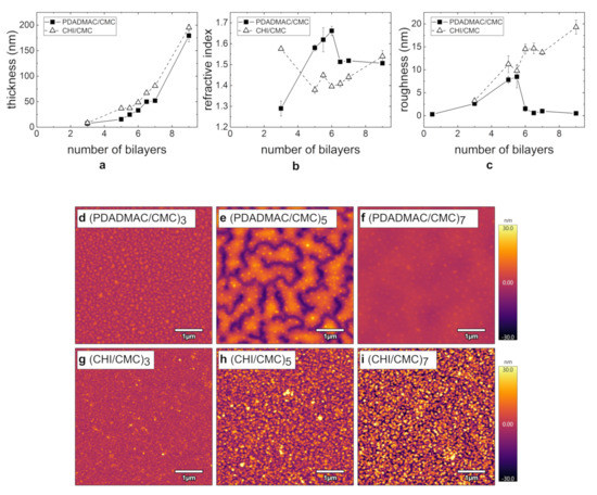 PEMs prepared from the polycations PDADMAC and CHI (pH = 4; c = 1 g/L) with a varying NoBL are characterized with respect to their thickness and morphology by ellipsometry (Figure 2a,b) and AFM (Figure 2c–i), respectively. In the figure, integers correspond to a bilayer terminating with the polyanion CMC and half numbers to the polycation as the outermost layer. The film thickness of both PE systems grows exponentially, whereas the CHI/CMC system results in slightly larger film thicknesses (Figure 2a). The refractive index grows with increasing film thickness and NoBL, with the exception at three BL, at which a much larger value is obtained (Figure 2b). In contrast, the PDADMAC/CMC system shows a significant increase in the refractive index with increasing NoBL. At six BL, a plateau is reached, leading to a constant value at higher BL. At nine BL, the refractive indices of both PE systems are similar to each other. A refractive index above 1.6 is uncommon for PEMs and is discussed in Section 4.1.