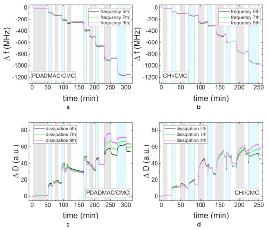 The change in frequency f (a,b) and dissipation D (c,d) measured by quartz crystal microbalance experiments with dissipation monitoring (QCM-D) for the PEMs PDADMAC/CMC and CHI/CMC. The gray region is the time period in which the polycation is adsorbed and the blue region in which the polyanion is adsorbed. The different curves in one plot represent different overtones of the measured intensity (5th, 7th, and 9th). All PE concentrations were set to 1 g/L, and the pH-value was maintained at pH = 4.