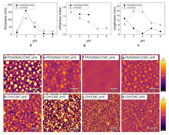 The topography of PDADMAC/CMC and CHI/CMC PEMs dependent on the pH and at seven BL was studied by AFM (Figure 4d–k). Height images reveal for both PE systems a strong agglomeration at pH 2 (Figure 4d,h). The agglomerates are spherical and have lateral diameters of several hundreds of nanometers. The height and lateral scale reveal that PDADMAC/CMC leads to larger agglomerates in all dimensions, but a lower packing density compared to the CHI/CMC PEM. With increasing pH, the PDADMAC/CMC agglomerates decrease in size, and the PEMs are overall smoother. The spherical aggregation progresses into a domain formation (Figure 4g). Figure 4c confirms the maximum roughness for pH 2 for PDADMAC/CMC, and the smoothest PEM with the lowest roughness is obtained at pH 4. This is in agreement with the topography images, as large agglomerates correlate with a high roughness. For the CHI/CMC PEM, the aggregate size decreases, and a higher packing density with increasing pH-value is obtained (Figure 4h–k). Here, the CHI/CMC PEMs have the largest roughness at pH 3 and pH 4 (Figure 4c). Overall, the roughness is generally lower for the PDADMAC/CMC PEMs compared to the CHI/CMC PEMs.