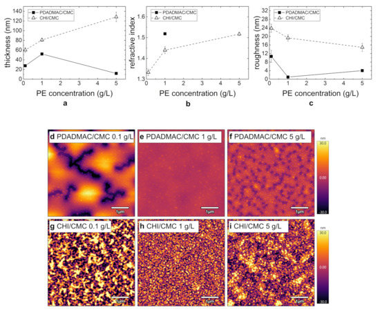(a,b) Change in thickness and refractive index for PDADMAC/CMC (filled squares) and CHI/CMC (empty triangles) with varying PE concentrations determined by ellipsometry (RH ≈ 40%). (c) Change in roughness, determined by AFM (RH ≈ 40%), with varying PE concentrations for PDADMAC/CMC (filled squares) and CHI/CMC (empty triangles). (d–i) AFM images (5 × 5 µm2) for PDADMAC/CMC and CHI/CMC with varying PE concentrations. For all images, the height scale is set to 60 . The NoBL was set to seven, and the concentration of all solutions was set to 1 g/L. The first bilayer corresponds to the bilayer of the precoat PEI and CMC.