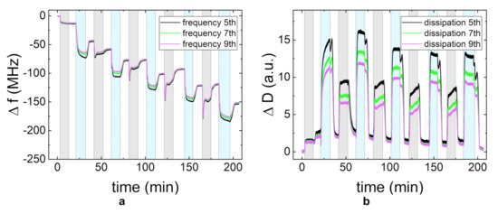 The change in frequency f (a) and dissipation D (b) measured by QCM-D for the PEM PDADMAC/CMC at 5 g/L. The gray region is the time period during which the polycation is adsorbed, the blue region in which the polyanion is adsorbed, and white for the rinsing periods. The different curves in one plot represent different overtones of the measured intensity (5th, 7th, and 9th). The pH-value was maintained at pH = 4.
