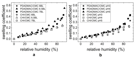 Figure 7 shows the swelling coefficient as a function of RH for both investigated PE systems. With increasing humidity, the film thicknesses of the studied PEMs PDADMAC/CMC and CHI/CMC increases (Figure 7a). Nevertheless, a different swelling behavior is observed for the two PE systems. The PDADMAC/CMC PEMs first swell linearly up to 70% RH. Above 70% RH, the film thickness swells exponentially. In addition, the water uptake depends on the kind of outermost PE layer (polycation or polyanion). As shown in Figure 7, the progression of the curves for the PEMs with CMC as the outermost layer (six BL and seven BL) is identical. For the PEM with PDADMAC as the outermost layer ( BL), a higher water uptake is observed. In the case of CHI/CMC, the swelling coefficient increases linearly with the relative humidity and is independent of the outermost PE. When comparing both PE systems to each other, it can be seen that the PDADMAC/CMC PEMs have overall higher swelling ratios, thus incorporating a higher quantity of water than the CHI/CMC PEMs.