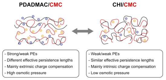 In this work, thin films in the form of PEMs are prepared by alternating dip-coating of the cellulose derivate CMC and the positively charged polyelectrolytes PDADMAC or CHI. These PEMs enable the study of the interaction between cellulose fibers with functional additives used for the modification of paper products. By using the cellulose derivate CMC, the water insolubility of cellulose is overcome and the formation of PEMs enabled. These PEMs exhibit unique film properties such as a controllable thickness and surface topography, which were characterized with a broad variety of experimental methods. The study reveals that PEMs formed with PDADMAC and CMC are flexible thin films. The PEMs prepared with more than six BL have a low roughness and show a homogeneous surface topography, which can be related to highly charged PDADMAC chains, which are adsorbed in a more stretched conformation than the CMC chains. Figure 8 shows the proposed structure for both PEM systems. Due to the high charge density, PDADMAC (Figure 8, left) has a longer effective persistence length (including backbone rigidity and charge effects) than CMC and CHI. Therefore, 1:1 stoichiometric complexation between PDADMAC and CMC is not fulfilled, which leads to pronounced extrinsic charge compensation by non-adsorbed counter ions in the PEM. The high amount of counter ions leads to a high osmotic pressure and a high water uptake of the PDADMAC/CMC PEMs. In addition, a lower amount of complexation sites allows parts of the PEM to move, which might explain the ability to form lateral domains under certain conditions. The similarity of persistence lengths of CHI and CMC (originating from similar backbone and charge densities) leads mainly to intrinsic charge compensation and a low osmotic pressure of the CHI/CMC PEM (Figure 8, right). Since both polysaccharides have bulky monomers, they form quite large loops, leading to larger agglomerates (roughness) and thickness than the PDADMAC/CMC PEM under certain pH conditions.