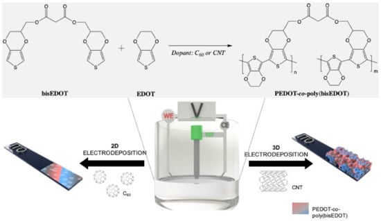 Carbon nanomaterials (CNMs) were immobilized in the working electrode via an electro-co-deposition within a conjugated polymer (CP). As represented in Figure 1, the electropolymerization between bisEDOT and EDOT was carried out on the working electrode in a three-electrode cell using two different methods, chronoamperometry and cyclic voltammetry. For the fabrication of the 2D films, bisEDOT or EDOT-co-bisEDOT monomers were electropolymerized on the working electrode in presence and in absence of solubilized C60 forming a thin film. Instead, for the 3D electrodes, the approach was similar to the one used before []: First a sucrose/CNT template was prepared by mixing the two components and molding into specific shape, and was then used as a working electrode during the polymerization and PEDOT-co-poly(bisPEDOT) (PbisP) were co-deposited within such template. Afterwards, the polymerized sucrose/CNT/PbisP structure was immersed into water to remove the sucrose and resulting in a self-standing structure.