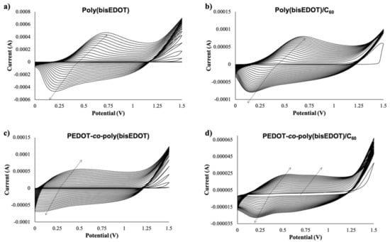 Due to its electron acceptor properties, electrodeposition of fullerene is feasible at negative values giving rise to poly(fullerene) []. Therefore, in order to avoid reduction of the fullerene species, poly(bisEDOT) (bisP) and PbisP were electropolymerized using cyclic voltammetries within the positive range from 0 V to +1.5 V during 20 scans (see Figure 2). Moreover, higher positive potentials may induce over oxidation of the PEDOT-derived compounds. As control, cyclic voltammetry of the polymerization of bisP and co-polymerization of PbisP in the absence of fullerene, i.e., doped with the TBAPF6 electrolyte solution, have also been performed. In all the cases, neither anodic nor cathodic peak appeared within the first cycle. As the polymerization progresses, the cycles present an increase of the current and displacement of the band to higher potentials for the oxidation and lower values in the reduction (see arrows in Figure 2), indicating the successful formation of an electroactive film on the ITO electrode surface.