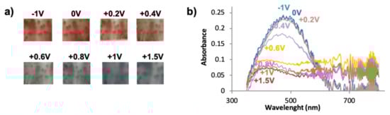 According to previous observations, we suggest that bisP/C60 presents higher crosslinked structures that may have an impact on the electrochromic properties, among others. In order to analyze this aspect, the film was deposited on an ITO electrode and UV-Vis spectra were recorded. At first glance, a color difference is observed with the naked eye in the reduced state of the polymers (−1.0 V, 0.0 V, +0.2 V, and +0.4 V): As shown in Figure 4a, the bisP/C60 films are red-brown while, in agreement to the literature, an intense dark violet coloration is observed for PEDOT/C60 []. Interestingly, light blue coloration appeared when both films were fully oxidized at +1.0 V and +1.5 V, with no evident color difference between the bisP/C60 and the PEDOT/C60 films.