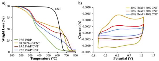 The presence of the bifunctional thiophene bisP was confirmed using CVs. As shown in Figure 6b, the PbisP/CNT scaffold with the highest amount of PEDOT, i.e., 40% of bisEDOT according to TGA, has an anodic band above 0.2 V with a cathodic sharp band at 0.1 V. The increment of the bifunctional component, i.e., 50% and 60% of polymer according to TGA, resulted in a dramatic decrease of the current, in addition to slight changes to lower potentials in the case of the anodic band (0.3 V) and higher potential cathodic band (0.35 V).