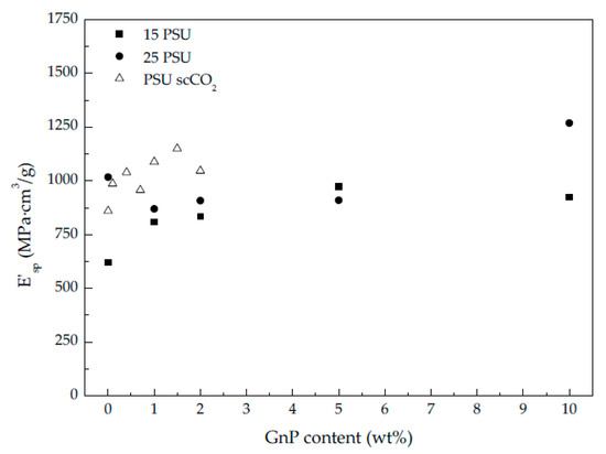 Specific storage modulus evolution of PSU and PSU-GnP nanocomposite foams with increasing GnP content.