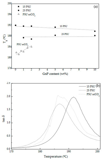 (a) Glass transition temperature of PSU measured at the maximum of tan δ for PSU and PSU-GnP nanocomposite foams with increasing GnP content and (b) comparative tan δ curves of 15 PSU, 25 PSU, and PSU scCO2 foams with 2 wt% GnP.