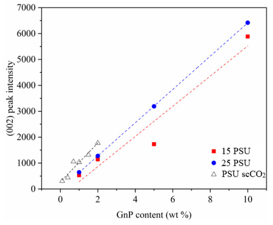 Normalized intensity value of the characteristic (002) diffraction plane of GnP for PSU and PSU–GnP nanocomposite foams and representation of the linear fits. The normalized peak intensity was determined by dividing the intensity by the density of each foam.