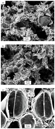 Using an average value of the elastic modulus of all unfoamed nanocomposites determined from the representation of the storage modulus of all foams as a function of relative density (graphically represented in Figure 5), it was possible to calculate the value of the exponent n that appears in Equation (2) for each foam series. Comparatively, 25 PSU and PSU scCO2 foams showed n values much lower than 15 PSU foams (1.38 and 1.40, respectively for 25 PSU and PSU scCO2 foams and 2.29 for 15 PSU foams), indicating for these foams a global mechanical behavior closer to a characteristic closed-cell structure (see comparative high-magnification micrographs presented in Figure 9).