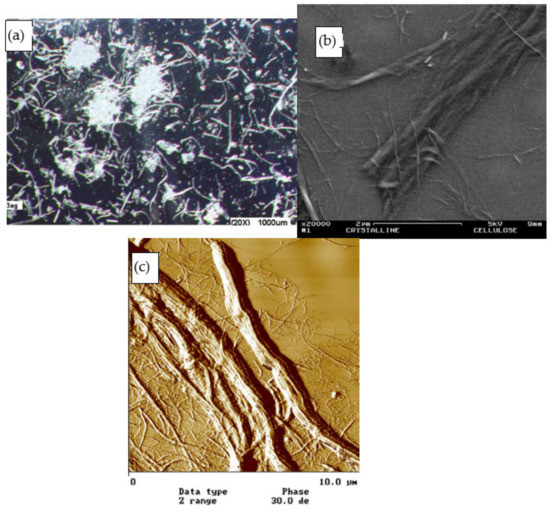 (a) Optical, (b) scanning electron microscope (SEM), and (c) atomic forced microscopy (AFM) micrographics of cellulose microfibers obtained from bagasse. Reproduced with permission [55]. Copyright 2008 Elsevier.