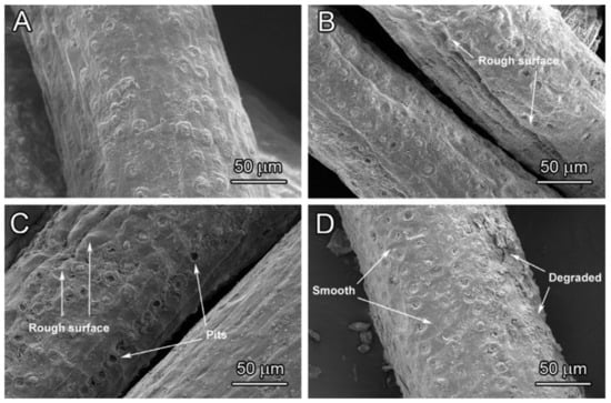 Scanning electron microscope (SEM) perhaps is the most widely used viewing tool for composite materials. It uses a focused beam of electrons, projected onto the targeted surface. The electrons interact with the surface atoms and produce various signals that contain information about the sample surface topography. A layer of gold was coated on the object surface to ensure stable transmitting of electrons. High definition of surface images allows researchers to identify what had happened on the specimen. Upon comparing treated fiber surface with the raw fiber, subsequent interfacial adhesion and composite characterizations can be predicted. The smooth native fiber surface is mainly due to the waxy layer. Rougher fiber surface and pits were observed after alkaline treatment, which removes non-cellulosic components from the fiber surfaces (Figure 8). This is important for the fiber for mechanical interlocking. Treatment parameters like concentration, treatment time, and temperature normally affect the fiber surface condition [56].
