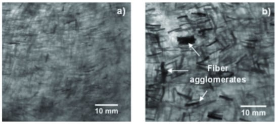 Transmission electron microscopy (TEM) analysis is usually conducted on nanoscale fiber reinforcements or film structure composites. Besides, effectiveness of nanocellulose production can be determined using this analysis via nanofiber diameter frequency distributions with aids of computer software [62,63,64]. Consistent nanocellulose fiber dimension typically led to superior composite performances. Besides, nanofiber dispersions and homogeneity are mainly viewed and discussed [65,66]. Fiber agglomeration issue was always found because of poor compatibility between the hydrophilic plant fibers and the hydrophobic matrix. This is more severe in nanocomposites because strong hydrogen bonding between the fibers made them hard to disperse [67]. Hence, a viewing tool like TEM could help in inspection, to locate the agglomeration spots (Figure 9). Fiber agglomeration inhibits complete wetting and to have good interface adhesion [68].