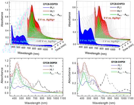 Absorption spectra of CFC8-DDPDI and CFC8-EHPDI layers on indium-tin oxide (ITO) substrates: before doping pristine (PL1—blue) and after doping hybrid (HL1—red) layers and as measured during Ag doping for 12 min at potential exceeding that of the first (−1 V vs. Ag/Ag+) reduction process (gray). Difference spectra (difference in the absorbance (A) of hybrid AHL and pristine APL layers: Adif = AHL − APL) are displayed by green curves.