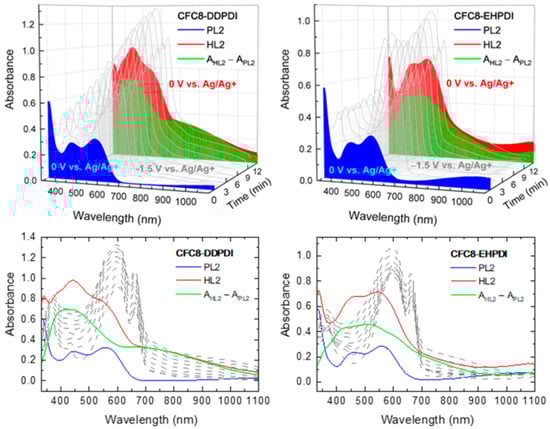 Absorption spectra of CFC8-DDPDI and CFC8-EHPDI layers on ITO substrates: before doping pristine (PL2—blue) and after doping hybrid (HL2—red) layers and as measured during Ag doping for 12 min at potential exceeding that of the second (−1.5 V vs. Ag/Ag+) reduction process (gray). Difference spectra (difference in the absorbance (A) of hybrid AHL and pristine APL layers: Adif = AHL − APL) are displayed by green curves.