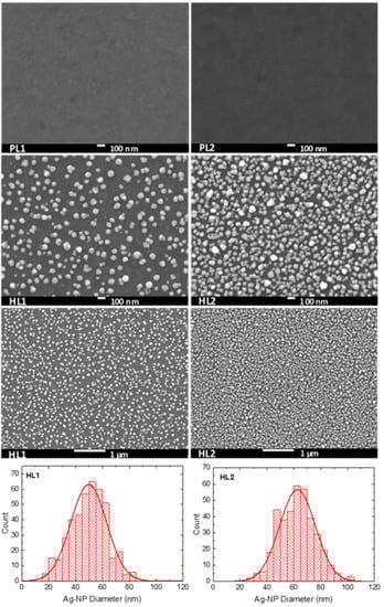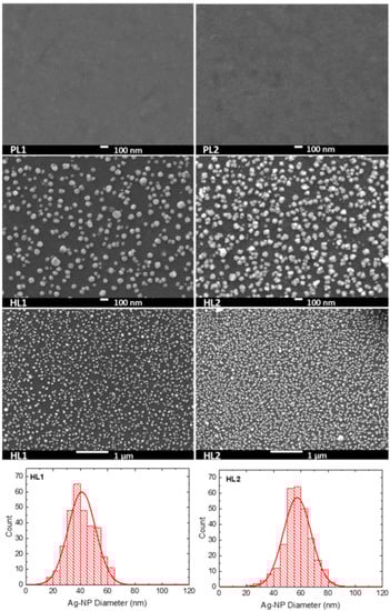 SEM images of pristine (PL1, PL2) and hybrid (HL1, HL2) thin-layer CFC8-DDPDI copolymer prepared at (left) −1.05 (HL1) and (right) −1.5 (HL2) V vs. Ag/Ag+ with histograms of the silver nanoparticle (Ag-NP) sizes and normal distribution function (Gaussian) fits.
