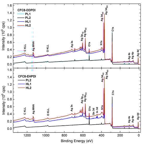 XPS wide (survey) spectra of the pristine and hybrid layers of CFC8-DDPDI and CFC8-EHPDI copolymers prepared at −1 (HL1) and −1.5 (HL2) V vs. Ag/Ag+.