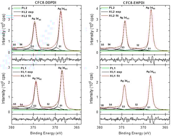 The high-resolution (HR) Ag 3d, C 1s, N 1s, and O 1s spectra showed more details. Representative HR spectra of pristine and hybrid layer surfaces are shown in Figure 7, Figure 8, Figure 9, Figure 10, Figure 11, Figure 12 and Figure 13. The HR Ag 3d spectra of the hybrid layers exhibit characteristic Ag 3d5/2–Ag 3d3/2 spin–orbit components with a spin–orbit splitting separation of 6 eV, whereas no peaks originating from silver appear in the Ag 3d spectra of the pristine copolymer layers. The spin–orbit splitting separation of 6 eV is in good agreement with the value for metallic Ag []. The BEs of Ag 3d5/2 in all Ag 3d spectra of the hybrid layers are in good agreement or slightly up-shifted compared with the Ag 3d5/2 BE of metallic Ag (368.28 eV). The up-shifts were detected in the spectra of the CFC8-DDPDI layers, with the most pronounced up-shift of 0.44 eV for the HL2 layers. Both the Ag 3d5/2 and Ag 3d3/2 main peaks show asymmetry; therefore, the HR Ag 3d spectra (Figure 7) have to be modeled with additional symmetrical lines corresponding to the satellites, similar to the metallic Ag spectrum. The satellites (S1, S3) with a 1–1.5 eV energy separation relative to the main Ag 3d5/2 and Ag 3d3/2 peaks can be interpreted as an emission process associated with an atomic-like pure p-screening, two other satellites (S2 and S4 ca. 3.5 eV) are associated with the plasmon loss features, and the fifth satellite (S5 ca. 12 eV) is due to the 4d → 5p shake-up [,,].