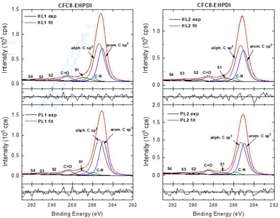 High-resolution C 1s spectra of CFC8-EHPDI pristine (PL1, PL2) and hybrid (HL1, HL2) layer surfaces, including components and normalized residuals displayed below the spectra.