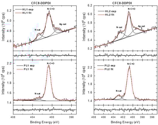 High-resolution N 1s spectra of CFC8-DDPDI pristine (PL1, PL2) and hybrid (HL1, HL2) layer surfaces, including components and normalized residuals displayed below the spectra.
