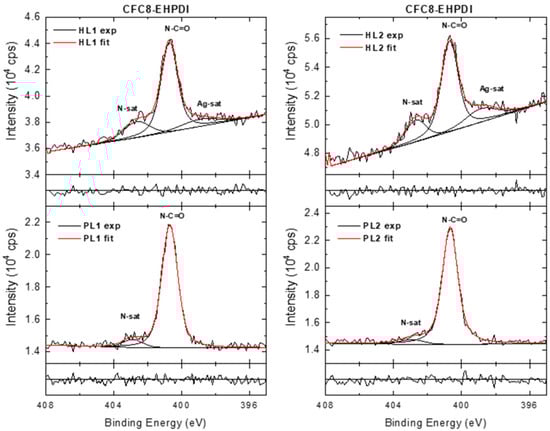 Quantitative XPS analysis is complicated by the elastic and inelastic scattering processes that occur during the transport of the excited electrons out of the solid. In the first approach, the traditional quantification analysis, in which the surface concentration is proportional to the measured peak intensity (or peak area considering the proper relative sensitivity factors (RSFs)), was used to obtain information about surface atomic element concentrations. The quantification was performed by using Casa XPS software considering the sum of C, N, O, and Ag atoms for the PL and HL layers as 100%. Regions up to approximately 30 eV below the peak kinetic energy (KE) were used for the evaluation. The results are summarized in Table 2. The quantification analysis revealed slightly higher amounts of oxygen than the values expected for the stochiometric ratio of the repeat copolymer unit (expected C:N:O is 77:2:4 for CFC8-DDPDI and 69:2:4 for CFC8-EHPDI). The higher O values (up to seven or eight atoms instead of four) arise predominantly from ambient atmosphere (air/water) contamination and, for the HL1 CFC8-EHPDI layer, partly from the ITO substrate, as mentioned above. Contaminating species (water and ITO) were determined from the detailed analysis of O 1s high-resolution spectra measured on several thin films and at different spots, as shown below. The evaluated atomic Ag percentage values up to 20% for the HL2 hybrid layers prepared at the potential of −1.5 V vs. Ag/Ag+, which exceeds the second reduction process potential corresponding to the PDI2− dianion formation, are higher than the Ag atomic percentage values of 12–15% for the HL1 layers prepared at the potential of −1 up to −1.05 V vs. Ag/Ag+ corresponding to the PDI− anion formation. The higher Ag contents for HL2 than for HL1 layers correlate well with the SEM results.