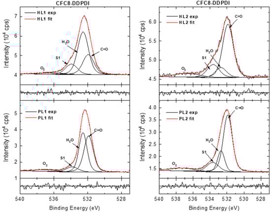 High-resolution O 1s spectra of CFC8-DDPDI pristine (PL1, PL2) and hybrid (HL1, HL2) layer surfaces, including components and normalized residuals displayed below the spectra.
