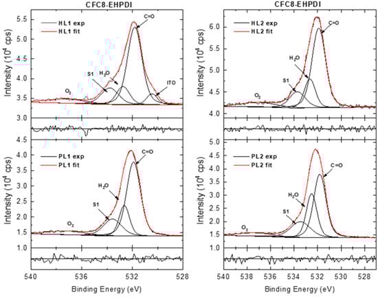 High-resolution O 1s spectra of CFC8-EHPDI pristine (PL1, PL2) and hybrid (HL1, HL2) layer surfaces, including components and normalized residuals displayed below the spectra.