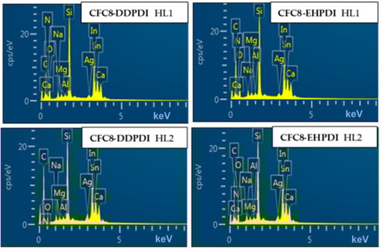 EDX pattern of the CFC8-DDPDI (left) and CFC8-EHPDI (right) hybrid layers.
