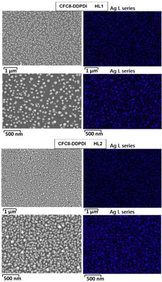 In this work, we report the preparation and detailed characterization of hybrid layers of two PDI-based copolymers (CFC8-DDPDI and CFC8-EHPDI in Figure 1) with silver nanoparticles (Ag-NPs) of average sizes below 100 nm. The thin hybrid layers were prepared during reduction by electrochemical doping of copolymer layers, using silver nitrate. The UV–vis absorption spectra were measured in situ during the hybrid layer preparation. Scanning electron microscopy (SEM) was used to study the layer morphology and to determine the sizes of Ag-NPs. X-ray photoelectron spectroscopy (XPS) was used to analyze the surface composition of the layers to prove Ag-NP formation in the hybrid layers and to determine whether there are any interactions between the silver and copolymers. Furthermore, the layers were characterized by energy dispersive X-ray spectroscopy (EDX). To the best of our knowledge, this is the first report on such hybrid layers having great potential for a variety of photonic applications.