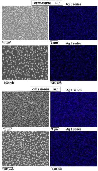 EDX analysis, which allows inspection of the spatial distribution of elements, also confirms the Ag-NP presence in the hybrid layers. EDX pattern and an example of elemental mapping images are shown in Figure 14, Figure 15 and Figure 16. Peaks corresponding to the C, O, N, and Ag atoms appear in the EDX spectrum of the hybrid layers. Additional strong peaks, such as the In, Sn, O, Na, Mg, Al, Si, and Ca peaks originating from the ITO glass substrate, are present because the EDX technique analyzes the X-ray characteristic radiation emitted upon bombarding the sample with electrons, which originates from depths up to 10 µm underneath the surface. The Ag percentage values determined from EDX analysis (atomic % considering as 100% the sum of all elements) and the Ag/C intensity peak ratio values given in Table 4 are significantly lower than the values determined from XPS analysis, which proves that the Ag-NPs are located at the surface layer. The relative values of the EDX results (normalized ) for the HL1 and HL2 layers are in very good agreement with the relative values obtained from XPS analysis (normalized ) and correlate well with the SEM results.