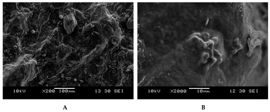 Scanning electron micrograph of G. blodgettii polysaccharide: magnification (A) 200×; (B) magnification 2000×.