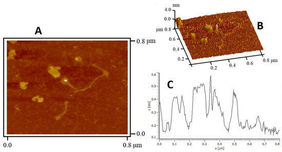 The surface topography of the GBP was illustrated was being rough with a tight structure, but it was not flat. Diverse polymeric chains in a linear conformation having an asymmetrical contour and size were observed (Figure 2A). AFM is an important tool for detecting the morphology of the polysaccharide that the macromolecules originated (Figure 3) [50]. Generally, the size of the polysaccharide molecular chain is about 0.1–1.0 nm [51]. The linearity and random coil conformation of GBP was obvious from the AFM micrograph. A height range of 0.12 to 0.58 nm was noted for GBP particles (average height of 0.30 ± 0.12 nm). Based on the result of the dilute polymer solution theory, the finding that GBP could be evidenced as being a linear polymer from SEM and AFM analysis.