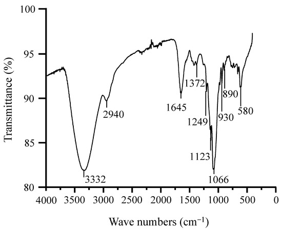 Spectrum analyses from FT–IR established that GBP contained AHG and that it was indeed a sulfated polysaccharide (Figure 4). Alkane C–H stretching was evident at 2940 cm−1, and O–H stretching was observed at 3332 cm−1, while the absorption at 1645 cm−1 corresponded to polymer bound water [52]. Sulfates in GBP were represented by the absorption observed at 1372 cm−1 in the spectrum [53]. The presence of S=O of sulfate esters, on the other hand, was denoted by the absorption at 1249 cm−1 [54]. Similarly, the peaks observed at 1123 cm−1 and 1066 cm−1 could be attributed to the asymmetric stretching of glycosidic bonds [55] and C–O stretching of AHG [54], respectively. The absorption at 930 cm−1, instead, corresponded to the C–O–C stretching of AHG [56]. Moreover, the presence of the C6 group in β-D-galactose was confirmed by the absorption at 890 cm−1 [55]. The absorption at 580 cm−1 likewise represented O=S=O bending [55].