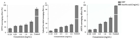 (A) DPPH scavenging effect, (B) HO scavenging effect and (C) ABTS scavenging effect of G. blodgettii polysaccharide (mean ± standard deviation, n = 3).
