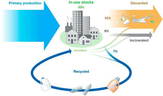 Plastic pollution has become one of the most pressing environmental issues, as the world’s ability to deal with plastic wastes is challenged by their rapid accumulation caused by their slow degradation rate, increasing sorting fee due to the complexity of the plastic products, and most importantly, little driving force from society. The rapid growth of the use and disposal of plastic materials has proved to be a burden to our ecosystem: from 2 million metric tons (MT) produced in 1950 to 359 MT generated in 2018, with a cumulative total of 8.3 billion MT as of 2018 [3]. Management of this enormous increase and quantity of plastic waste has been challenging, especially in the areas of rapid economic development and population growth. Between 1950 and 2015, approximately 8% of plastics ever produced have been incinerated, while only 7% have been recycled. Most of the produced plastics (around 55%) were discarded and are accumulating in landfills or the natural environment, while the rest are currently in use (see Figure 1) [3].
