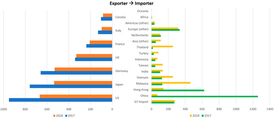 Comparison of exports of plastic waste, pairings and scrap from G7 countries in the first half of 2017 and 2018 (in kilo tons) (adapted from [11]).