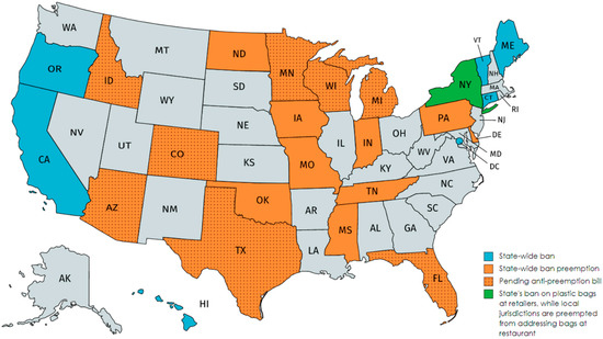 - Gibbens, S. See the Complicated Landscape of Plastic Bans in the U.S. National Geographic. Available online: https://www.nationalgeographic.com/environment/2019/08/map-shows-the-complicated-landscape-of-plastic-bans/ (accessed on 19 February 2020).