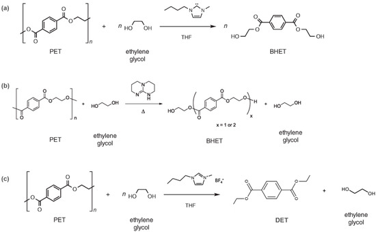 Reaction scheme of the depolymerization of polyethylene terephthalate (PET) using (a) N-heterocyclic carbenes [26], (b) guanidine 1,5,7-Triazabicyclo[4.4.0]dec-5-ene (TBD) [32], and (c) 1-Butyl-3-methylimidazolium tetrafluoroborate ([Bmim][BF4]) [33].